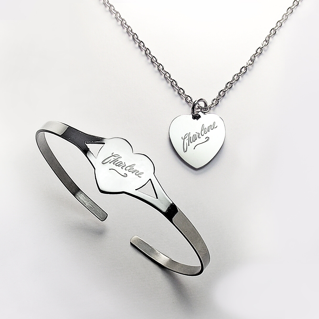 Stainless Steel Solid Heart Pendant and Cuff Bracelet Set.
