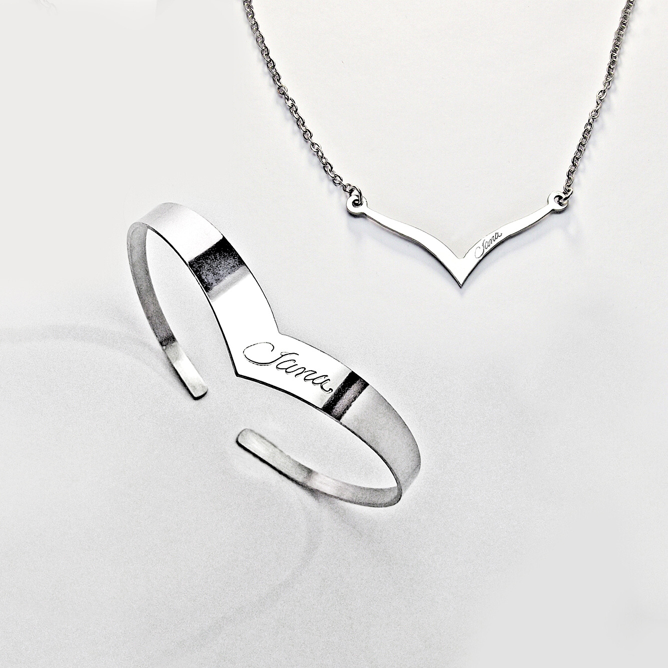 Stainless Steel Wishbone Pendant and Cuff Bracelet Set.